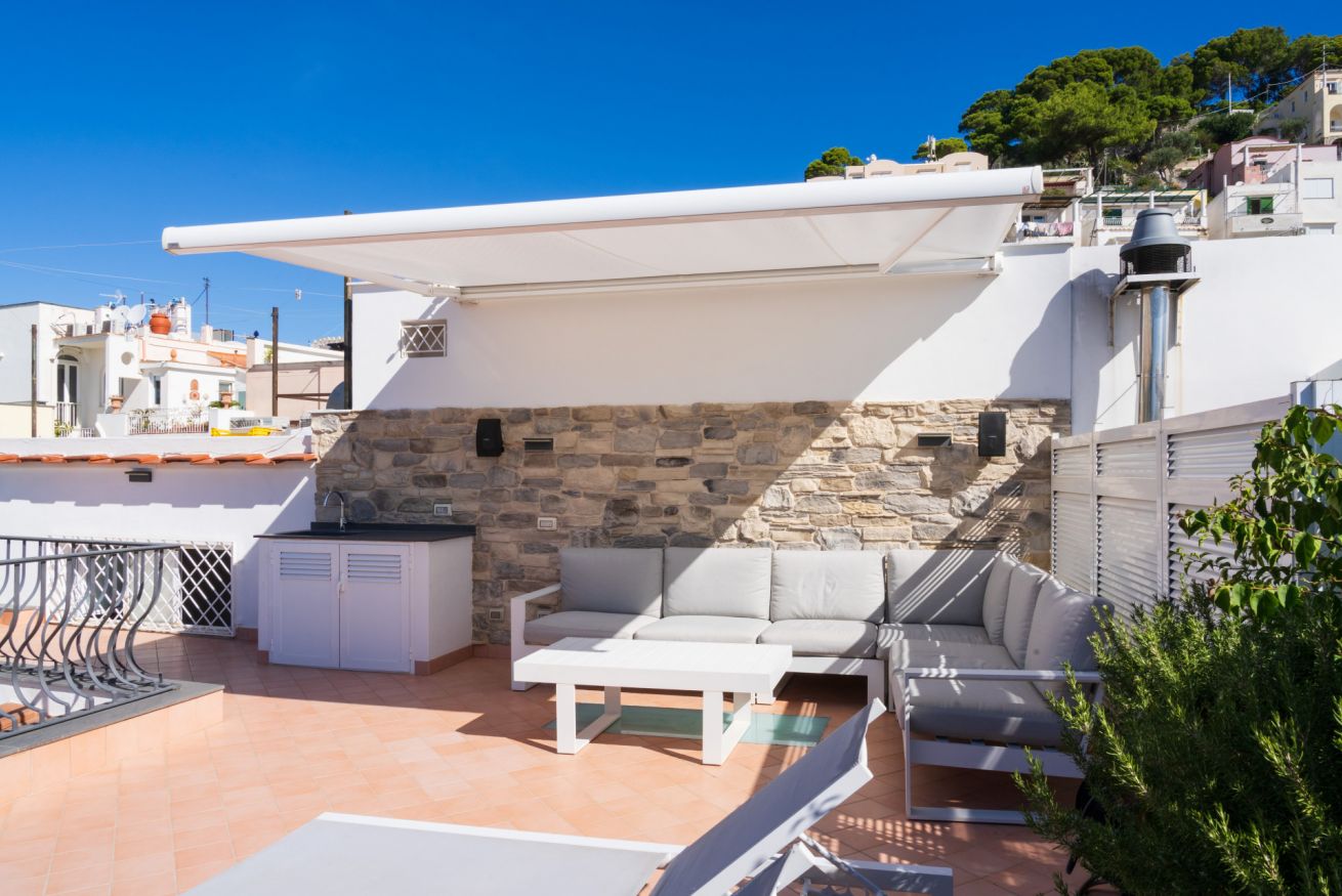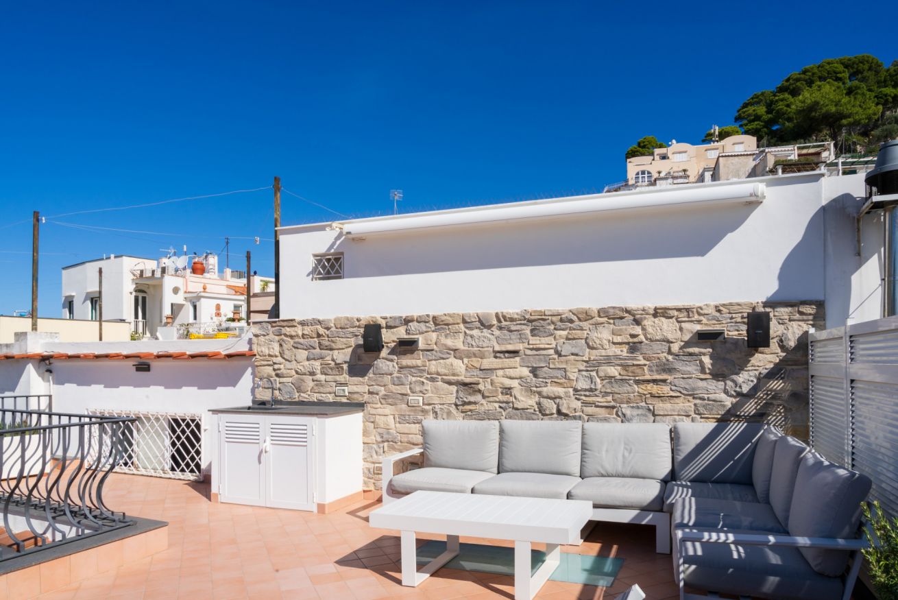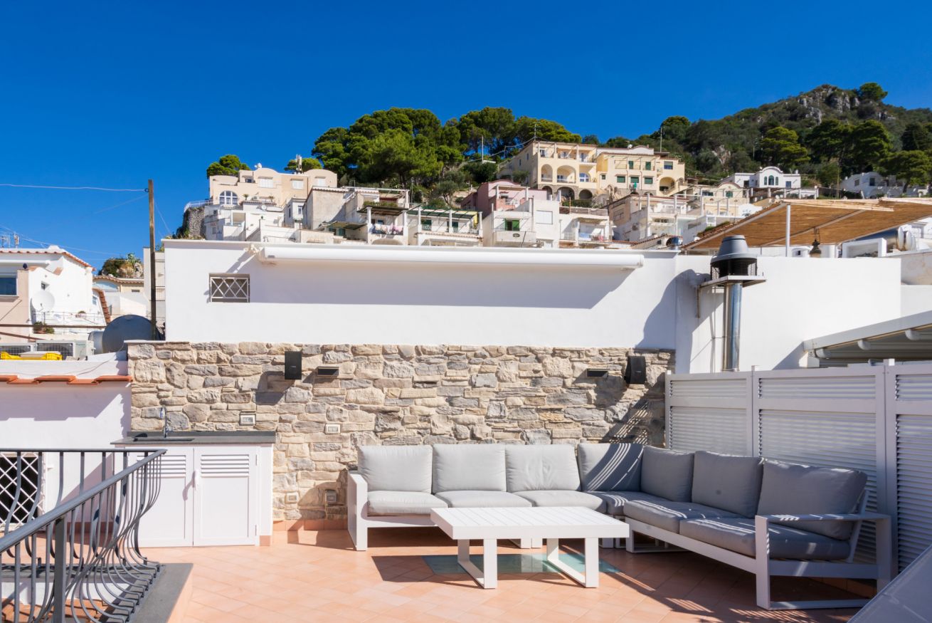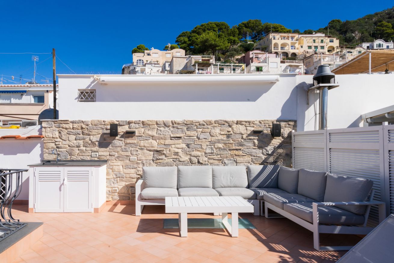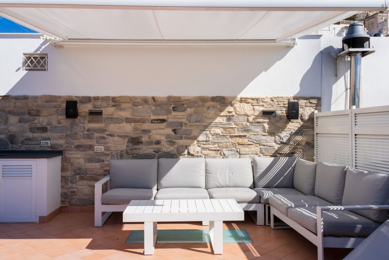 Appartamento situato in pieno centro, a pochissimi passi dalla piazzetta. L'appartamento è composto da una camera matrimoniale con bagno en-suite, camera singola con ulteriore letto estraibile e bagno en-suite, cucina e soggiorno con divano letto. Completa la proprietà un terrazzo di copertura arredato con divanetti e lettini prendisole accessibile con scala a chiocciola.